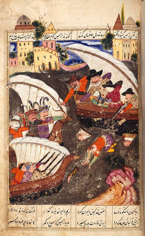 Image:British Library. Imam Quli Khan’s soldiers in boats repulsed by the Portuguese at Hurmuz,Miniature painting.